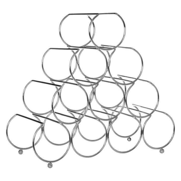 "Made from strong chrome wire, the rack's silver colour allows it to be coordinated with other metallic kitchen accessories. Its pyramid design produces a wide base that makes the stand stable and secure, while large rounded docks make depositing and removing bottles easy. Four round feet at the base ensure the rack is slightly raised from kitchen surfaces." materials: Metal composition:Iron 100% colour: Silver Care & Use Instr: Wipe with a soft cloth, do not use abrasive cleaners. Dishwasher Safe: N Electric Hob Safe: N Freezer Safe: N Gas Hob Safe: N Halogen Hob Safe: N Induction Hob Safe: N Materials: Metal Microwave Safe: N Oven Safe: N Product Depth: 17 Product Height: 36 Product Weight (kg): 1.175 Product Width: 41 Item Assembled: Y Courier Service: Evri Packet