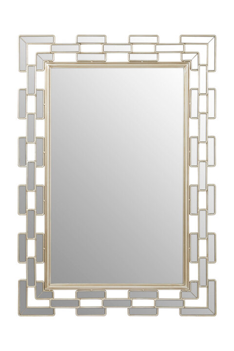 Its slim iron frame has a champagne finish that coordinates with silver coloured metallic lighting and accessories. A series of small rectangular mirrors form a pattern around the frame, adding depth and volume to this distinctive piece. materials: Glass composition:Metal, Wood, Glass Care & Use Instr: "Wipe With A Soft Cloth, Do Not Use Abrasive Cleaners" Dishwasher Safe: N Electric Hob Safe: N Freezer Safe: N Gas Hob Safe: N Halogen Hob Safe: N Induction Hob Safe: N Materials: Glass Microwave Safe: N Oven Safe: N Product Depth: 3 Product Height: 86 Product Weight (kg): 9 Product Width: 61 Item Assembled: Y