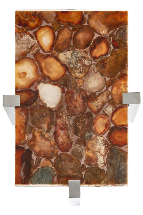 Shades of brown and orange comprise the Relic wall light's warm and rich colour palette, contrasting with the cool stainless steel frame. Crafted from agate stone, this natural accent piece is a stylish lighting fixture. materials: Metal, Stone composition:Metal, Textile Bulb Included: N Bulb Info: 1 Qty E27 8W Care & Use Instr: Wipe Clean With Soft Cloth. Do Not Use Abrasive Cleaners. Dishwasher Safe: N Electric Hob Safe: N Freezer Safe: N Gas Hob Safe: N Halogen Hob Safe: N Induction Hob Safe: N Materials: Metal, Stone Microwave Safe: N Oven Safe: N Product Depth: 16 Product Height: 32 Product Weight (kg): 7 Product Width: 24 Item Assembled: Y