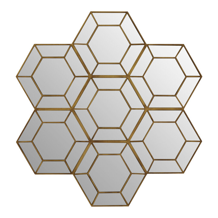 The seven hexagonal forms that are clustered together combine to create a reflective array. The sides of the mirror are finished in a warm gold colour, complementing the slim lines that house the individual mirrored panes on the surface of this contemporary piece. Coordinate this art deco-inspired piece with geometric lighting and textiles. materials: Glass, Wood composition:Wood, Glass Care & Use Instr: Wipe with a soft cloth, do not use abrasive cleaners Dishwasher Safe: N Electric Hob Safe: N Freezer Safe: N Gas Hob Safe: N Halogen Hob Safe: N Induction Hob Safe: N Materials: Glass, Wood Microwave Safe: N Oven Safe: N Product Depth: 4 Product Height: 91 Product Weight (kg): 15.1 Product Width: 95 Can Mirror be Hung Horizontally and Vertically?: Y Item Assembled: Y Weight Capacity: 10kg