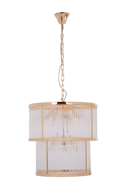 Elegantly crafted and fixed in an iron frame with warm metallic finishing, this two tier drum shaped chandelier has curtains of vertical glass rods that retract the light and create a warm diffused glow in the room. materials: Metal, Glass composition:Metal, Glass Bulb Included: N Bulb Info: E14 40WX9 Care & Use Instr: Wipe with a soft cloth, do not use abrasive cleaners. Dishwasher Safe: N Electric Hob Safe: N Freezer Safe: N Gas Hob Safe: N Halogen Hob Safe: N Induction Hob Safe: N Materials: Metal, Glass Microwave Safe: N Oven Safe: N Product Depth: 55 Product Height: 127 Product Weight (kg): 13.4 Product Width: 55 Item Assembled: N
