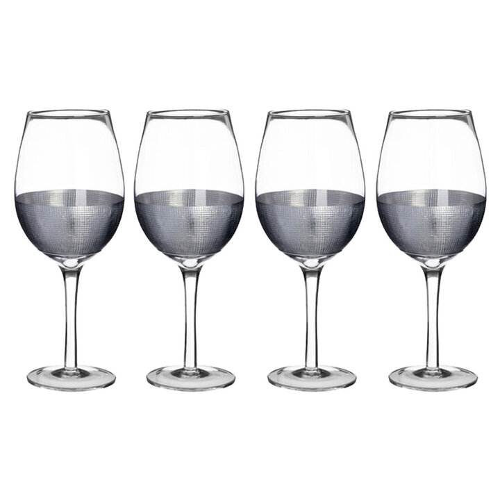 "These large wine glasses are presented in a set of four, and have textured crosshatch detail on their bowls. They are designed to hold 500ml of wine, and make an eye-catching display piece when not in use. Part of the Apollo range, these glasses make an ideal match with the other glasses in the set, and are a great way to introduce a silver tone into the kitchen." materials: Glass composition:Glass 100% colour: Silver Capacity: 500ml Care & Use Instr: Wash With Warm Soapy Water. Do Not Use Abrasive Cleaners. Dishwasher Safe: N Electric Hob Safe: N Freezer Safe: N Gas Hob Safe: N Halogen Hob Safe: N Induction Hob Safe: N Materials: Glass Microwave Safe: N Oven Safe: N Product Depth: 7 Product Height: 23 Product Weight (kg): 0.87 Product Width: 7 Item Assembled: Y Courier Service: Evri Packet