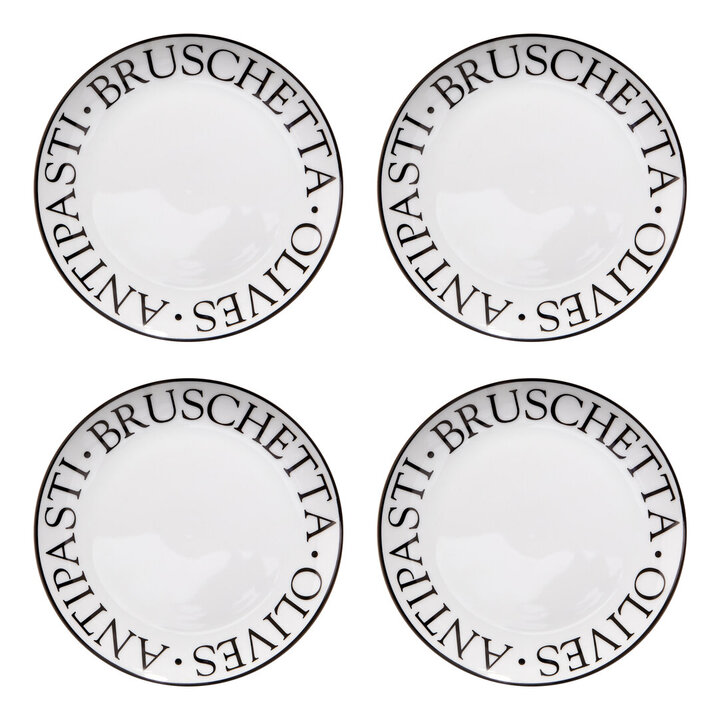 "Each plate is made from smooth porcelain, with a glazed finish that accentuates the clean white finish. Black lettering on the outer rim spells out popular antipasti types, with coordinating black piping on the outer rim. The design incorporates slightly raised edges to ensure that food remains on the plate. Bespoke packaging makes them giftable." materials: Ceramic composition:Porcelain. 100% colour: White Care & Use Instr: Use Warm Water And Washing-Up Liquid To Clean. Dishwasher Safe: Y Electric Hob Safe: N Freezer Safe: N Gas Hob Safe: N Halogen Hob Safe: N Induction Hob Safe: N Materials: Ceramic Microwave Safe: Y Oven Safe: N Product Depth: 19 Product Height: 2.3 Product Weight (kg): 1.25 Product Width: 19 Item Assembled: Y Courier Service: Evri Packet