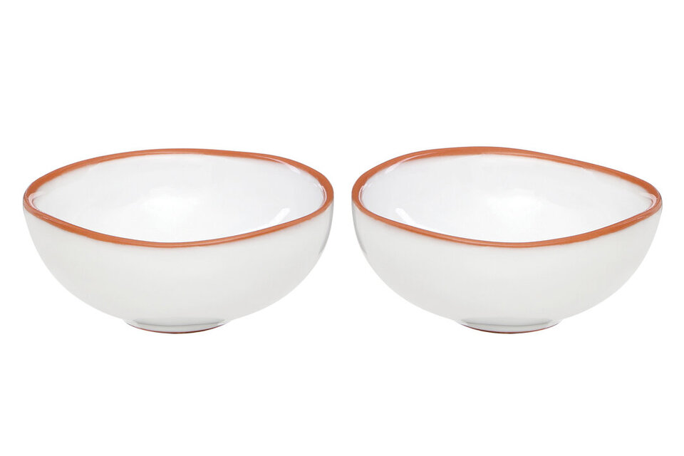 "The beautiful white glazed finish of the Calisto set of 2 mini bowls will bring a contemporary look to the traditional dinnerware, and provide a charming addition to your table setting. Carefully crafted from natural terracotta, the white glazing gives the bowls a smooth finish which helps to accentuate their shape. The durable and easy to clean bowls makes them ideal for serving hors d'oeuvres lunches, dinners and parties. A beautiful white finish with natural terracotta trim will complement most decors, adding a freshness to your table. A wonderful addition for everyday dining, the set of 2 Calisto mini bowls will bring a touch of chic to the occasion."