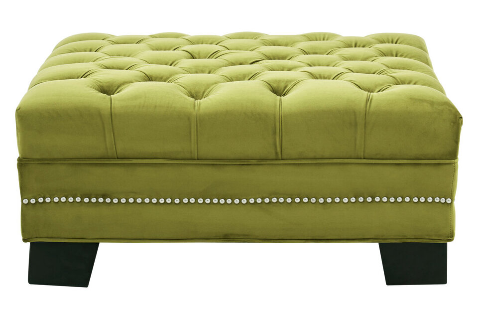 This footstool is upholstered in moss coloured velvet which gives it a tactile finish. Its square design seat has deep button tufting which creates texture and adds a classical twist to the look. Stud detailing on the lower outer gives the footstool a hint of metallic detail. Renewable rubberwood feet are elegantly carved to complete the contemporary aesthetic.