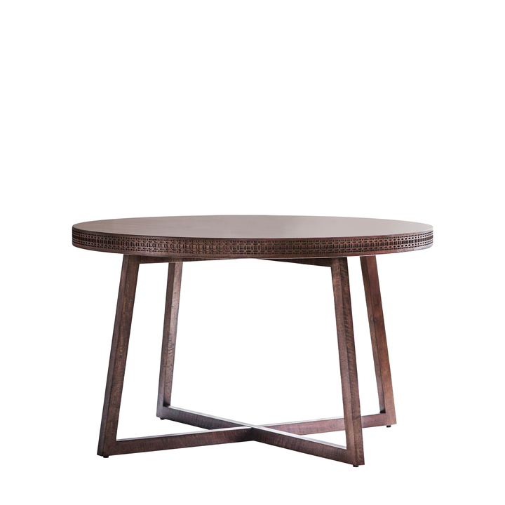 Offering a global traveller look that has a hint of ethnic design detail, this beautiful piece is exciting but timeless in its approach and so can be mixed with modern or classic pieces in an eclectic space. Made using Mango solids with mixed timber veneers of Teak, Mahogany, Mindy Ash and Mango which give contrast and make the inlaid pattern stand out. It has a stunning brown finish - the different grains in the mixed timbers stand out in the light and catch your eye with this beautiful detail.\n\n Material: Mango / Mindi / Mahogany / MDF Shape: Round Seats - Table / Bench: 4 Assembly Required: Yes