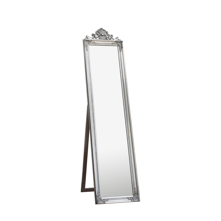 Elegant full length cheval with decorative crest in silver leaf finish. Material: Glass / Resin / Wood Type - Mirror: Cheval Style - Mirror: Baroque Shape - Mirror: Rectangle Glass Type: Bevelled Frame Width: 60mm Fixing Type: Stand