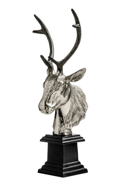 "A wonderful accessory in your bedroom, dining room or living space, the deer head sculpture will provide your home with a fantastic focal point. The elegantly shaped deer's head is made from metal, and with a rich, metallic nickel finish, the contours are accentuated for a more glamorous style. Contrasting the head, a brown wooden plinth ensures stability, while giving it a traditional feel. Easy to maintain with a dusting cloth or brush. Complementing most decors, the deer head sculpture will add style and character to your room."