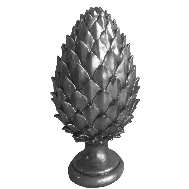 A masterfully executed metallic pinecone finial showcases intricate textural details and a lustrous silver finish that reflects light with remarkable brilliance. The substantial scale and expert craftsmanship make this piece an outstanding focal point for luxury retail environments and upscale home décor collections. The organic form draws inspiration from botanical elements while maintaining a refined aesthetic that appeals to discerning clientele. This statement piece pairs beautifully with the coordinating Hydria glass vases, mirrored stag head trays, and decorative trinket jars to create cohesive merchandising displays. The versatile design element works equally well in both traditional and contemporary settings, making it an excellent inventory choice for retailers catering to diverse style preferences. The distinctive silhouette and quality construction ensure this item will maintain its appeal across seasons, providing reliable sales potential throughout the year. Consider grouping with metallic finished accessories and complementary decorative objects to maximize visual impact and cross-merchandising opportunities.