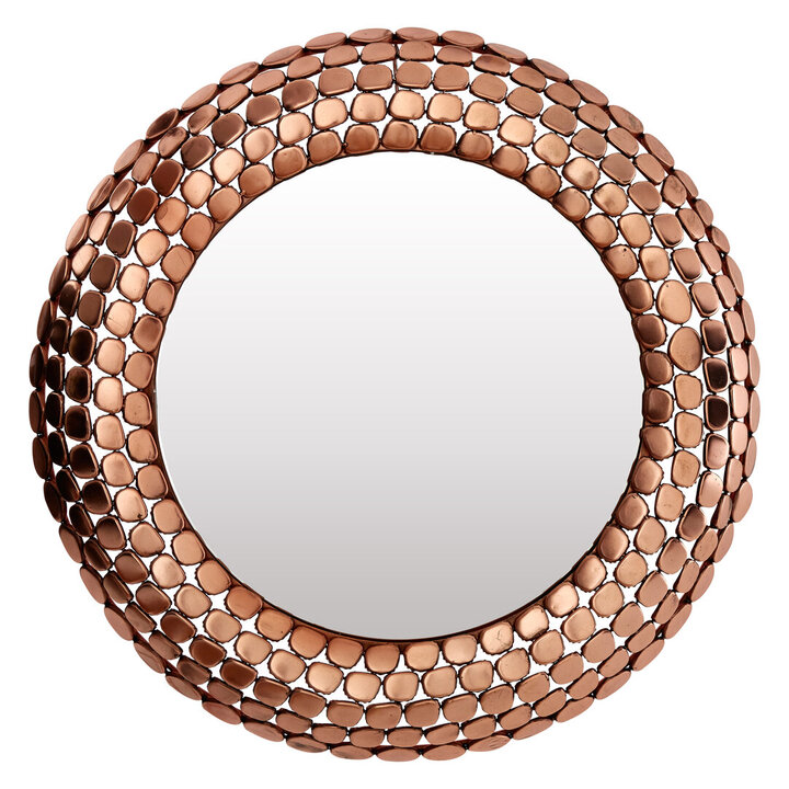 Made from durable iron, the frame is comprised of hundreds of adjoining pebble shapes, each displaying a warm copper finish. The five layers curve gently outwards and back, lending volume to this eclectic focal mirror.