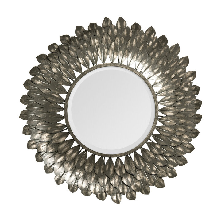 The central round mirror has luxurious bevelled edges. Bordered by a sliver of distressed grey iron, it will refract the light beautifully. Spreading out from the mirror, four layers of overlapping iron leaves rest on a strong and stable MDF frame. Gently distressed, each leaf's indented stem highlights the attention to detail evident on this statement piece.