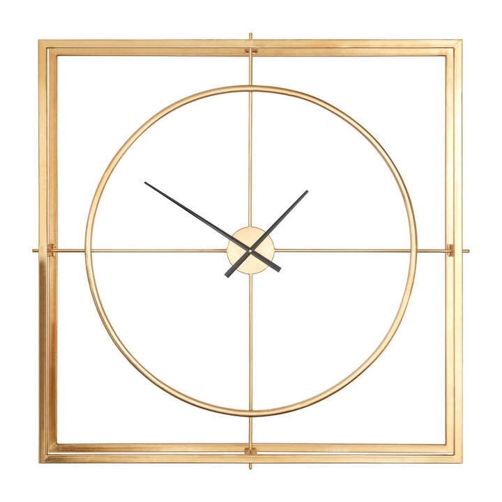This wall clock has a double layer design, with vertical and horizontal rods that intersect through the circle. It is made from smooth metal and has a gold finish that complements warm metallic accessories. materials: Metal composition:1% Plastic, 90% Mdf Veneer, 9% Acrylic colour: Gold Bulb Included: N Care & Use Instr: Wipe clean with a soft cloth Dishwasher Safe: N Electric Hob Safe: N Freezer Safe: N Gas Hob Safe: N Halogen Hob Safe: N Induction Hob Safe: N Materials: Metal Microwave Safe: N Oven Safe: N Product Depth: 11 Product Height: 103 Product Weight (kg): 5.3 Product Width: 103 Item Assembled: Y Courier Service: Evri Light & Large