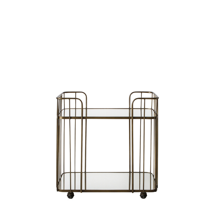 This entertaining essential features a toughened glass top and shelf with an art deco styled antique bronze finished metal frame and castors so it can effortlessly be wheeled into position whenever required. Material: Glass / MDF / Metal Additional Information: Top and bottom mirrored shelf