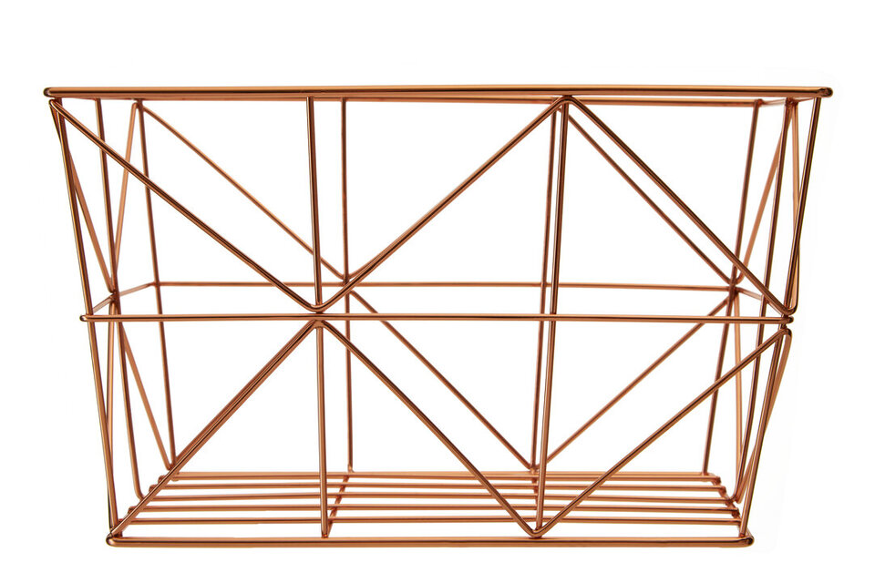 "The basket is made from strong iron and boasts a warm copper finish. It has a contemporary wireframe construction with tapered design lines. These combine to create an array of triangular patterns. Part of the metallic Vertex collection, it can be used to store cutlery, utensils, or other small kitchen accessories." materials: Metal composition:Iron 100% colour: Gold Care & Use Instr: "Wipe With A Soft Cloth, Do Not Use Abrasive Cleaners" Dishwasher Safe: N Electric Hob Safe: N Freezer Safe: N Gas Hob Safe: N Halogen Hob Safe: N Induction Hob Safe: N Materials: Metal Microwave Safe: N Oven Safe: N Product Depth: 16 Product Height: 28 Product Weight (kg): 0.39 Product Width: 20 Item Assembled: N Courier Service: Evri Packet