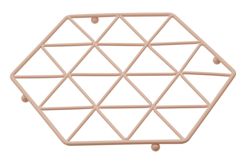 Forming the shape of a hexagon, the strong iron wire frame has a pastel pink plated finish that coordinates well with the Vertex utensil holder. Four small feet keep it slightly raised from surfaces, allowing air to circulate under the hot pot or pan. materials: Metal composition:Iron 100% colour: Pink Care & Use Instr: Wipe clean with a damp cloth Dishwasher Safe: N Electric Hob Safe: N Freezer Safe: N Gas Hob Safe: N Halogen Hob Safe: N Induction Hob Safe: N Materials: Metal Microwave Safe: N Oven Safe: N Product Depth: 22 Product Height: 2 Product Weight (kg): 0.133 Product Width: 22 Item Assembled: Y Courier Service: Evri Packet