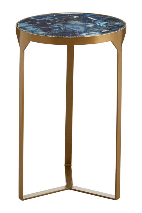 The slim frame of this luxurious side table is made from smooth iron and features a rich antique brass finish. Its three legs intersect at the base. A piece of round polished agate stone is set into the top of the table. This semi-precious material boasts a variety of blue tones expressed through inconsistent patterns. materials: Stone composition:100% Care & Use Instr: Wipe with a soft cloth, do not use abrasive cleaners. Dishwasher Safe: N Electric Hob Safe: N Freezer Safe: N Gas Hob Safe: N Halogen Hob Safe: N Induction Hob Safe: N Materials: Stone Microwave Safe: N Oven Safe: N Product Depth: 37 Product Height: 56 Product Weight (kg): 8.2 Product Width: 37 Item Assembled: N