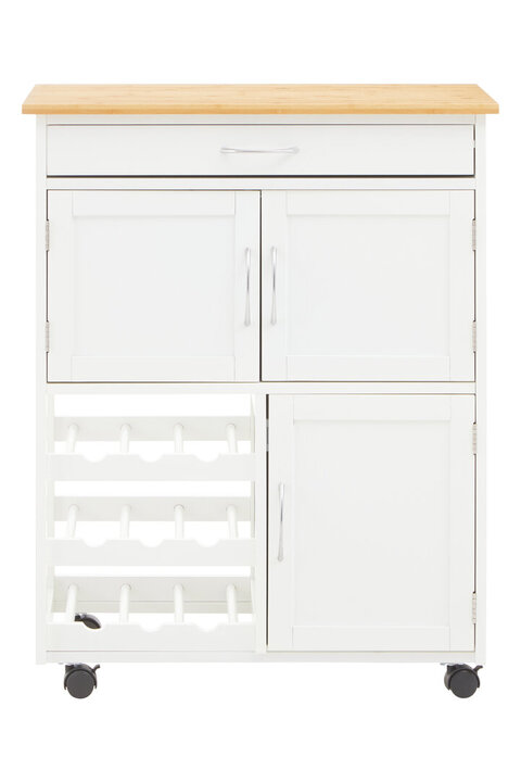 Helping to keep your kitchen organised and tidy, the multi-purpose kitchen trolley will provide a storage solution for a clutter free home. The robust trolley is made from durable MDF and given a white finish to freshen up your d?cor. Complementing the white is a bamboo top that gives you added surface space, making it ideal during food preparation. A single cupboard door and a double door are ideal for keeping your fruit and veg, pots and pans or condiments, while the drawer is suitable for placing cutlery, chopping boards, placemats or utensils, keeping them close to hand but out of sight. 9 spaces are allocated for your wine bottles keeping them safely stored and your countertops clutter free. Sitting on castors, the trolley is easy to manoeuvre so it doesn't get in your way. You can even use it as a serving trolley if required. Stylish and practical, the kitchen trolley will make an everyday use addition in your home.