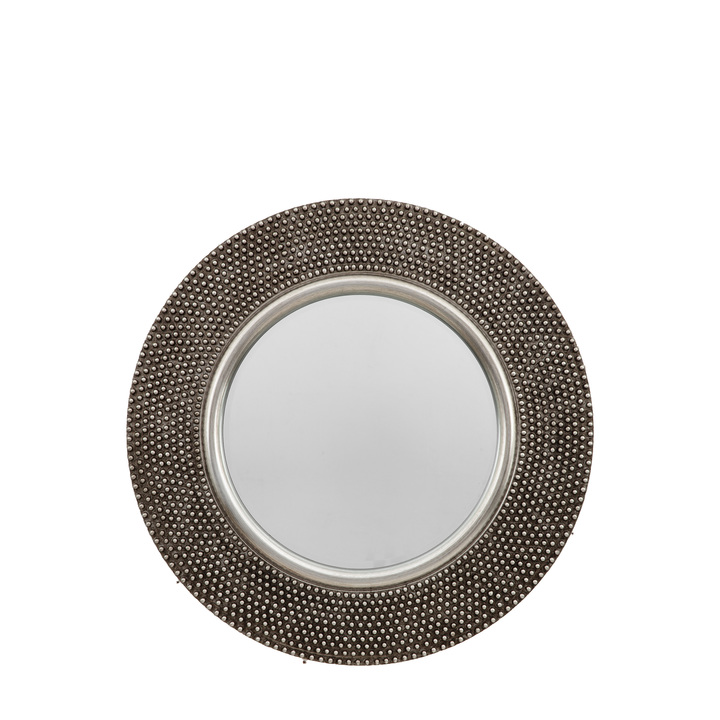 Round Frame with a raised bobble effect pewter finish. Material: Glass / PU Type - Mirror: Wall Style - Mirror: Modern Shape - Mirror: Round Hanging Orientation: Portrait Glass Type: Bevelled Frame Width: 164mm Fixing Type: D-Ring