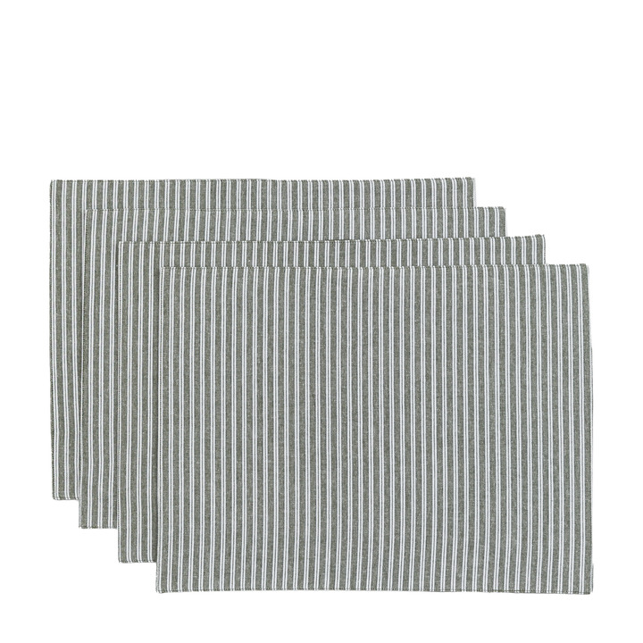 Perfect for adding a sophisticated traditional touch to any dining table, this set of 4 green strip placemats will set the table with style. Pack Of: 4 Material: 100% Cotton Product Zone: Indoor Fabric Weight: Front: 185 GSM / Rear: 130 GSM Technique: Woven Care Instructions - Textiles: 30 Degrees / Do Not Bleach / Line Dry / Low Heat / Do Not Dry Clean / Wash Dark Colour Separately