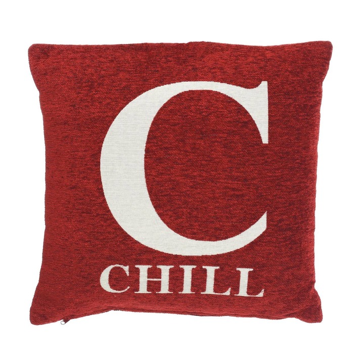 "The charming style of the 'chill' cushion will bring a colourful touch and a wonderful decorative feature for your bed, chair or sofa. Made from 100% polyester, the red cushion features a chenille jacquard finish and is soft to the touch for a comfortable feel. The cushion is filled with hollow fibre for good spring, while helping allergy sufferers. Accentuated against the red, worded 'chill' and the letter 'C' in off-white, gives the cushion a stylish look that will complement most settings."