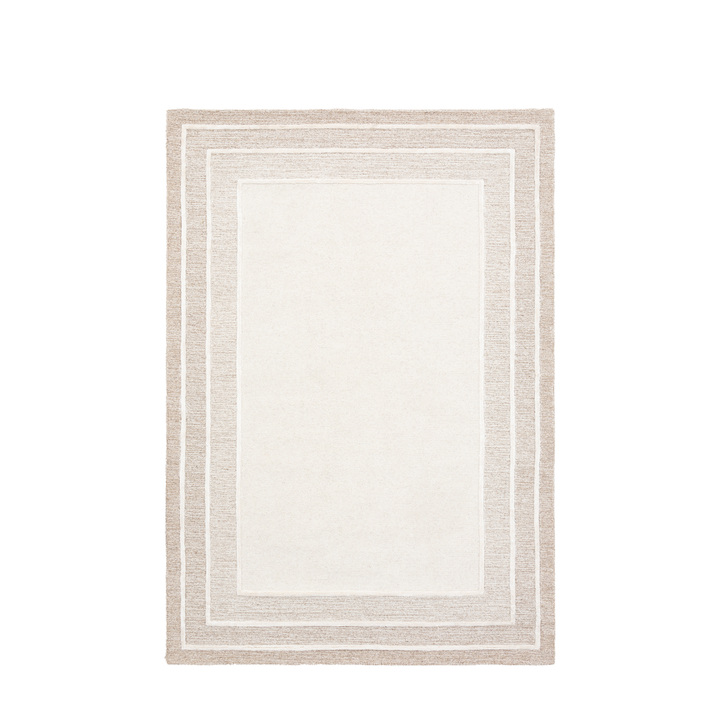 The contemporary design and sleek neutral tones of this rug make it a perfect fit for a wide range of interior styles. A hand tufted construction creates depth and detail in the design while providing a soft feel underfoot. Material: Polyester / Wool Product Zone: Indoor Fabric Weight: Front: 1500 GSM / Rear: 1300 GSM Technique: Front: Tufted / Rear: Latex Pile: 10 Pattern: Colour Bordered Shape - Rugs: Rectangular Care Instructions - Textiles: Do Not Wash / Do Not Bleach / Do Not Tumble Dry / Do Not Iron / Do Not Dry Clean / Spot Clean Only
