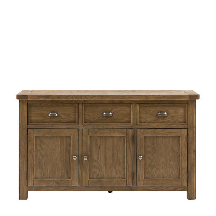 Discover ultimate storage with this generously sized sideboard. Featuring three spacious drawers and three cupboards, this sideboard offers exceptional storage for kitchens, living spaces and hallways. The warm wood finish of the solid oak & veneers is full of natural grain detail, perfectly complemented by classic metal handles, creating a blend of timeless style and substance. Material: Oak / Oak Veneer / Pine / MDF Product Zone: Indoor Leg / Feet Height: 818mm Clearance to Floor: 818mm Storage: 3 Drawers Internal Drawer Size: W413 x D174 x H120mm Internal Cupboard Size: W400 x D275 x H420 Adjustable Shelves: Yes Distance between shelves: 235mm Assembly Required: No Anti Topple Kit: Yes