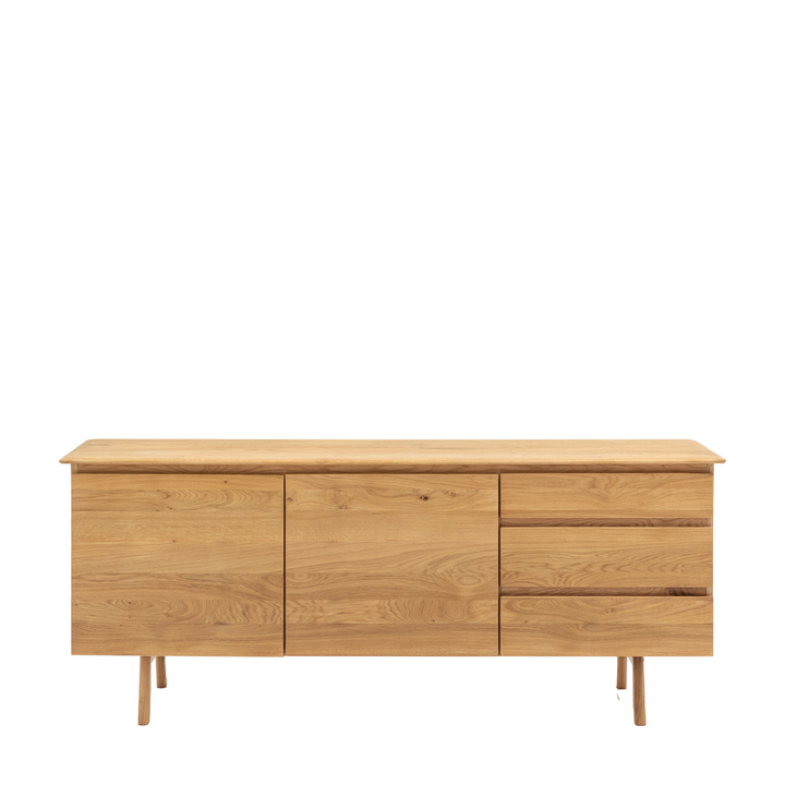 This sideboard is functional as well as stylish - with three drawers and two doors this centre piece will be a stand out design in any home Material: MDF / Oak / Pine Storage: 2 Doors / 3 Drawers Internal Drawer Size: 546x330x118, 546x330x158, 546x330x158 Internal Cupboard Size: 546x330x520 Distance between shelves: 249mm Assembly Required: Yes