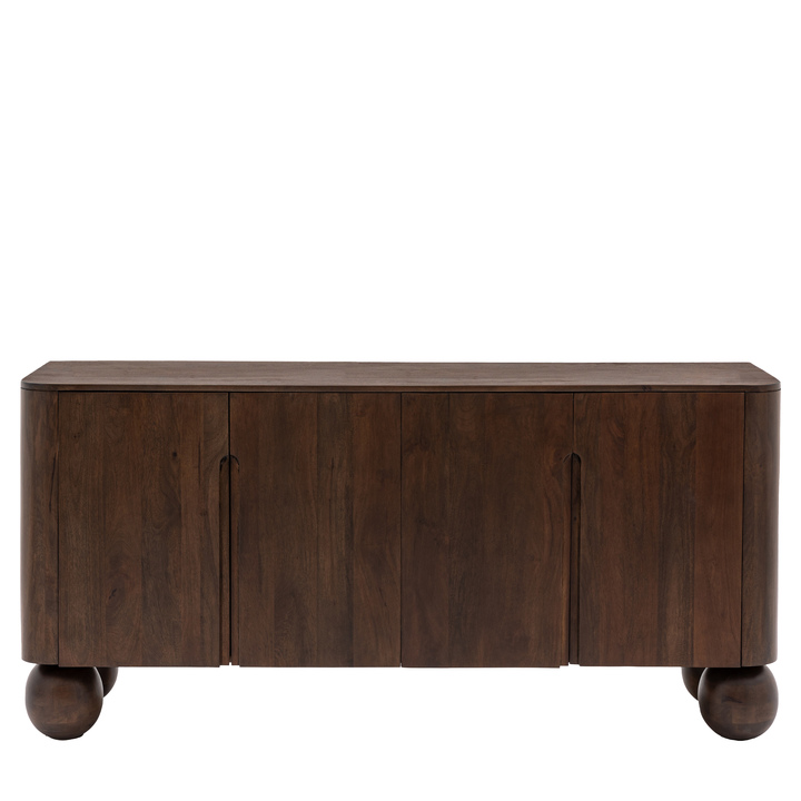 This eye-catching sideboard is crafted using mango wood solids with a rich deep finish. The front corners of the sideboard are gently curved with the elegant slim cut-out handles on the doors curving at the top to echo this. Turned ball feet complete the look to create this dramatic retro piece. Coordinating items are available. Material: Mango Wood Product Zone: Indoor Shape: Rectangle Leg / Feet Height: 180mm Clearance to Floor: 180mm Storage: 4 Doors / 1 Shelf Internal Cupboard Size: W820 x D370 x H590mm Adjustable Shelves: Yes Distance between shelves: 285mm Assembly Required: Leg / Foot Only