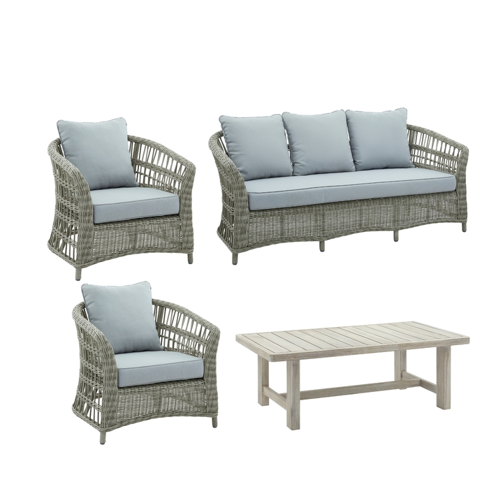 A meticulously designed outdoor collection that sets new standards in durability and visual appeal. The intricate 5mm half-round HDPE wicker weave creates a realistic appearance while offering unmatched resilience against outdoor conditions. The lightweight yet robust powder-coated aluminum frame ensures lasting stability without compromising on style. The set showcases an eco-conscious approach with its fast-growing acacia hardwood table, demonstrating environmental responsibility while maintaining luxury standards. The attention to detail extends to the Grade 5 Olefin fabric cushions, which maintain their vibrancy while providing superior moisture resistance and quick-drying properties compared to conventional materials. This collection represents the perfect fusion of practicality and refinement, making it an essential addition to any retail lineup. For a cohesive outdoor aesthetic, we recommend pairing with the Siena Large Brown Amphora Pot, complemented by the understated charm of the Pula Table Lamp, and finished with the rustic appeal of our Large White Clock with Beaded Frame. The combination of weatherproof construction, year-round outdoor durability, and minimal maintenance requirements makes this set an profitable investment for retailers seeking to meet the growing demand for high-quality outdoor living solutions. The three seater dimensions are (L)180cm x (D)80cm x (H)77cm, Table is (L)115cm x (W)65cm x (H)41cm and the Armchair is (D)80cm x (W)80cm x (H)77cm. Material: METAL Colour: BEIGE Delivery Size: Large Weight: 102.0000