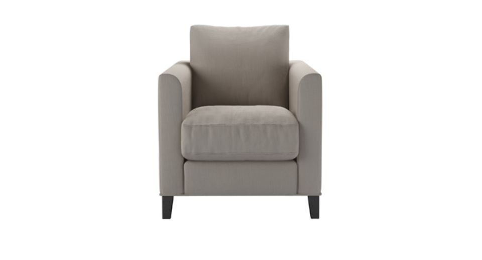 The Izzy's modest and contemporary style is perfect for practical and simple living. A straight-edged frame, with structured arms, plump cushions and tall oak legs make this one comfy sofa! Its slender arms with a gentle curve add an air of charm to the minimalist design. back cushions: feather and fibre color: grey,natural covers: fixed seat cushions: feather wrapped foam size: Armchair