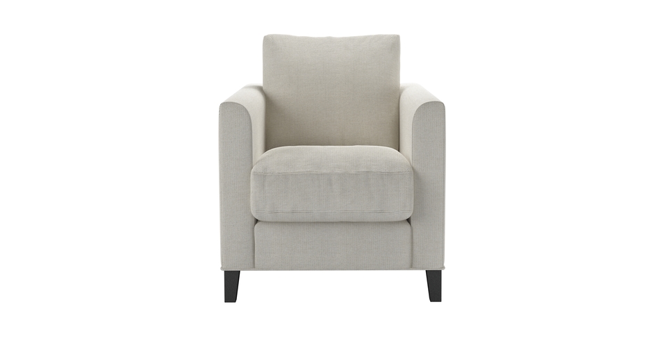 The Izzy's modest and contemporary style is perfect for practical and simple living. A straight-edged frame, with structured arms, plump cushions and tall oak legs make this one comfy sofa! Its slender arms with a gentle curve add an air of charm to the minimalist design. back cushions: feather and fibre color: natural covers: fixed seat cushions: feather wrapped foam size: Armchair