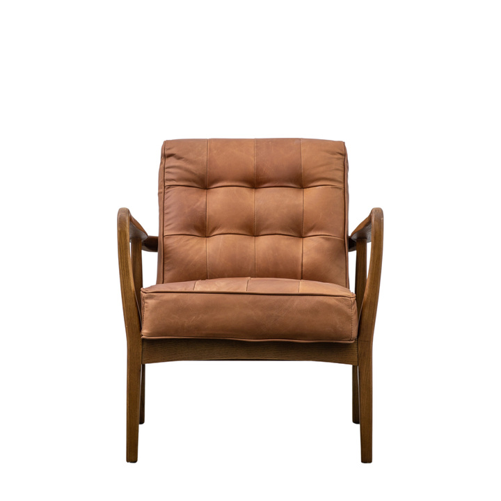 Mid century stand out personality piece with a solid oak angled frame twinned with top grain vintage brown leather and deep pull detailing. Material: Oak / Leather Seat Height: 450mm