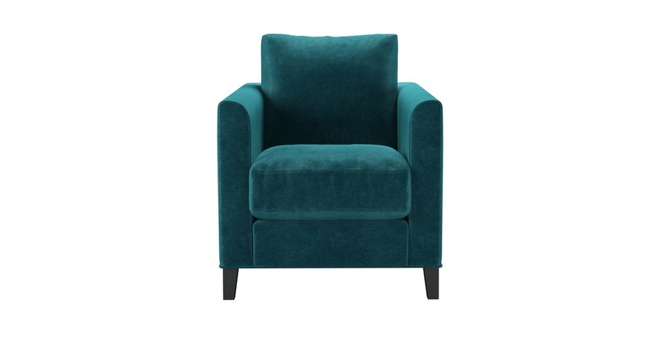 The Izzy's modest and contemporary style is perfect for practical and simple living. A straight-edged frame, with structured arms, plump cushions and tall oak legs make this one comfy sofa! Its slender arms with a gentle curve add an air of charm to the minimalist design. back cushions: feather and fibre color: green,blue covers: fixed seat cushions: feather wrapped foam size: Armchair