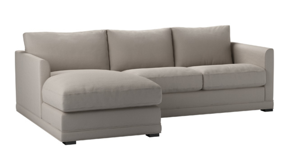 A sofa made for corners. back cushions: feather and fibre color: grey,natural covers: fixed seat cushions: feather wrapped foam size: Small Left Hand Chaise