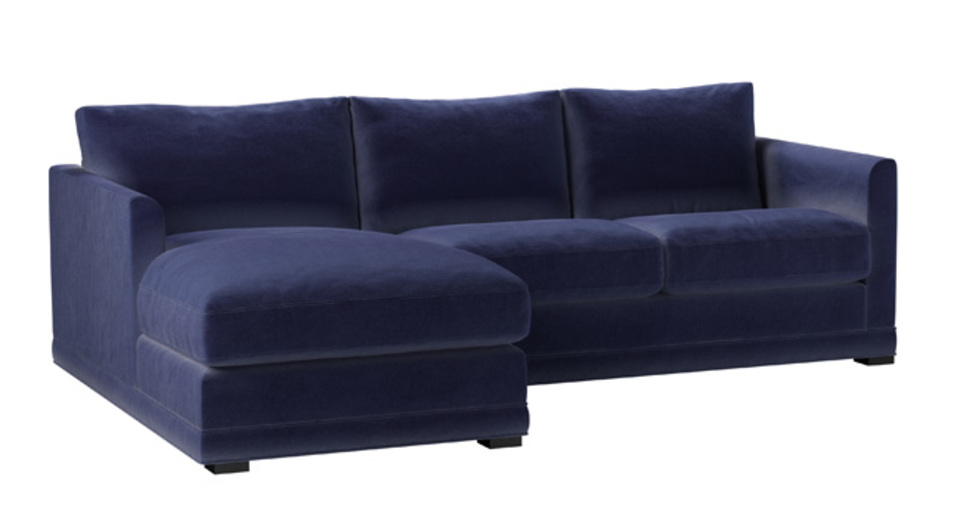 A sofa made for corners. back cushions: feather and fibre color: blue covers: fixed seat cushions: feather wrapped foam size: Small Left Hand Chaise