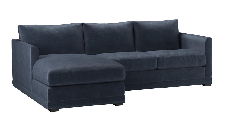 A sofa made for corners. back cushions: feather and fibre color: Blue, Grey covers: fixed seat cushions: feather wrapped foam size: Small Left Hand Chaise