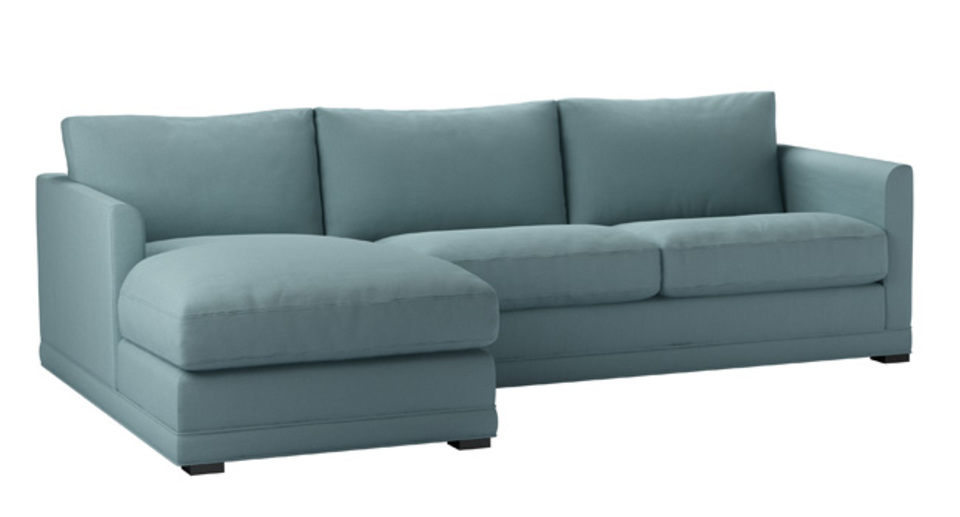 A sofa made for corners. back cushions: feather and fibre color: blue covers: fixed seat cushions: feather wrapped foam size: Medium Left Hand Chaise