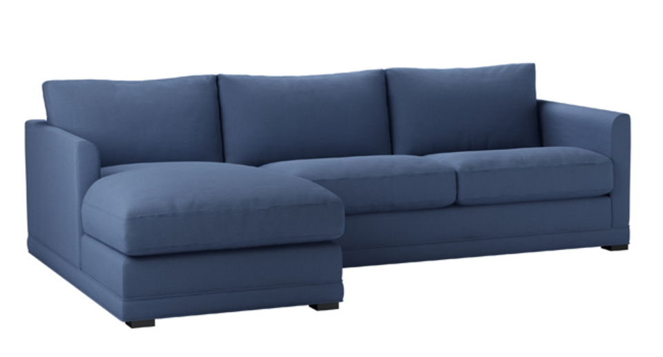 A sofa made for corners. back cushions: feather and fibre color: blue covers: fixed seat cushions: feather wrapped foam size: Medium Left Hand Chaise