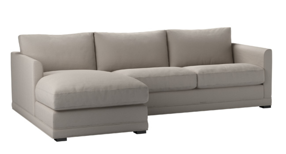 A sofa made for corners. back cushions: feather and fibre color: grey,natural covers: fixed seat cushions: feather wrapped foam size: Medium Left Hand Chaise