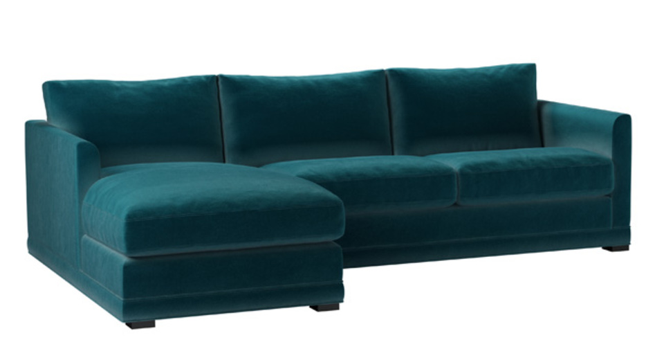 A sofa made for corners. back cushions: feather and fibre color: green,blue covers: fixed seat cushions: feather wrapped foam size: Medium Left Hand Chaise