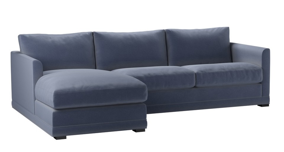 A sofa made for corners. back cushions: feather and fibre color: blue covers: fixed seat cushions: feather wrapped foam size: Medium Left Hand Chaise