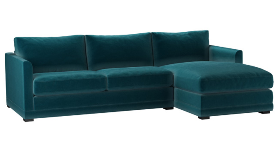A sofa made for corners. back cushions: feather and fibre color: green,blue covers: fixed seat cushions: feather wrapped foam size: Medium Right Hand Chaise