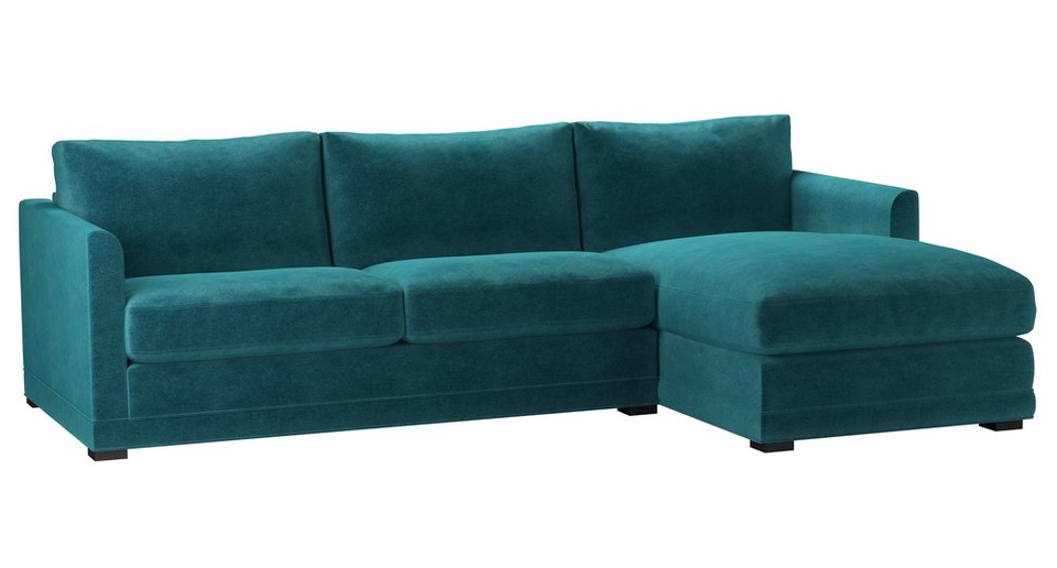A sofa made for corners. back cushions: feather and fibre color: green,blue covers: fixed seat cushions: feather wrapped foam size: Medium Right Hand Chaise