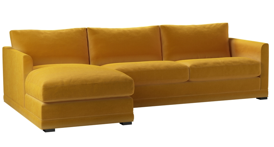 A sofa made for corners. back cushions: feather and fibre color: yellow covers: fixed seat cushions: feather wrapped foam size: Large Left Hand Chaise