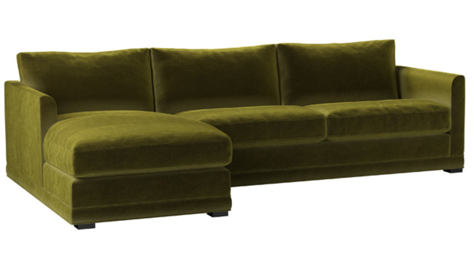 A sofa made for corners. back cushions: feather and fibre color: green covers: fixed seat cushions: feather wrapped foam size: Large Left Hand Chaise