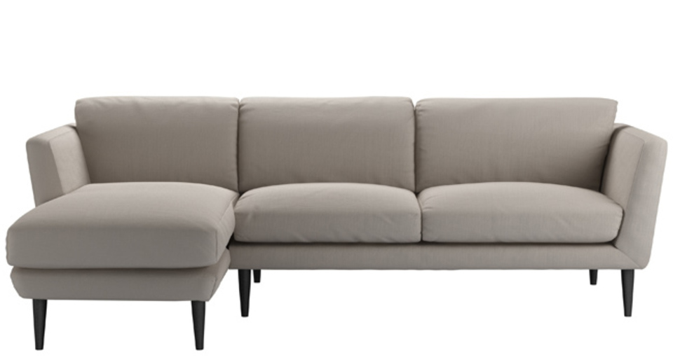 The Holly's retro-inspired shape and simple elegance is a nod to the sleek and curvy mid-century style. A neat frame - with high, splayed arms, a deep seat, and lots of comfy cushions - sits on tall tapered legs. This is one cool sofa. back cushions: 100% feather color: grey,natural covers: fixed seat cushions: feather wrapped foam size: Left Hand Chaise
