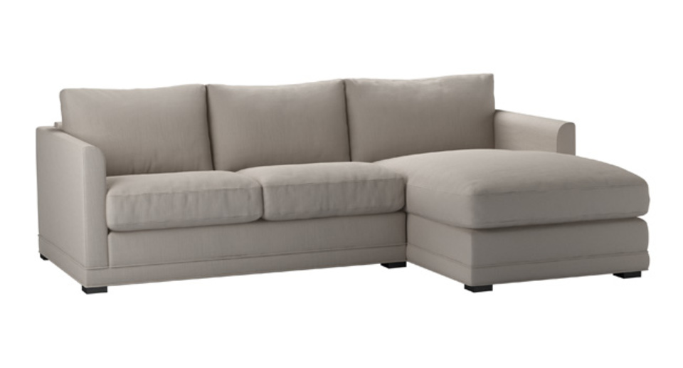 A sofa made for corners. back cushions: feather and fibre color: grey,natural covers: fixed seat cushions: feather wrapped foam size: Small Right Hand Chaise