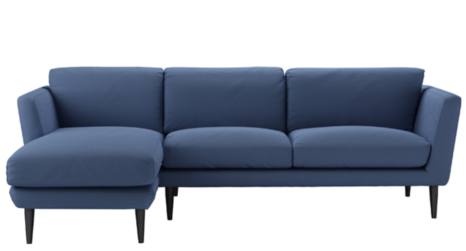 The Holly's retro-inspired shape and simple elegance is a nod to the sleek and curvy mid-century style. A neat frame - with high, splayed arms, a deep seat, and lots of comfy cushions - sits on tall tapered legs. This is one cool sofa. back cushions: 100% feather color: blue covers: fixed seat cushions: feather wrapped foam size: Left Hand Chaise