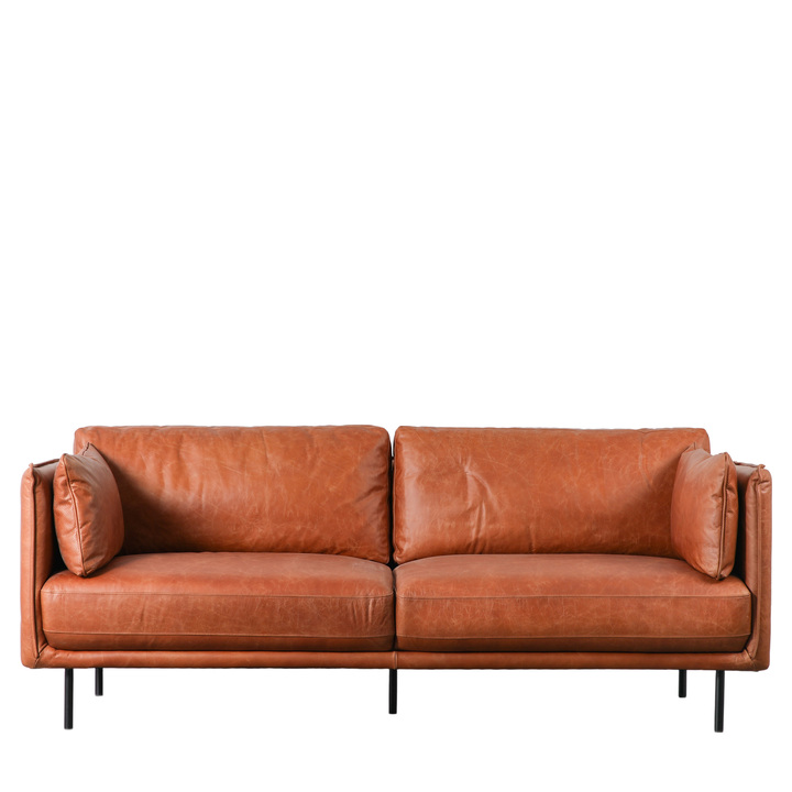 Offering a sleek contemporary look, this stylish sofa is fully upholstered in a lovely warm brown leather, with black metal legs perfectly complementing the design. The slim arms feature stitch seam detailing which is echoed on the side cushions. Material: Maple / Leather / Plywood / Foam / Polyfibre / Iron Seat Height: 450mm Seat Width between arms: 1520mm Seat Depth: 570mm Assembly Required: Yes - legs / feet only