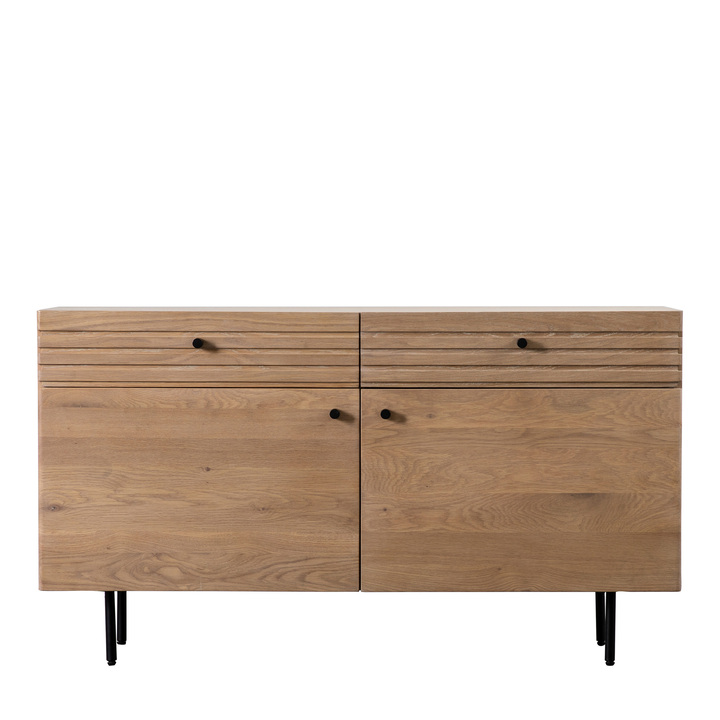 This unique collection offers a range of living, dining and bedroom furniture with a beautiful contemporary Japandi style. Crafted from solid oak and oak veneers, great attention to detail has been given to the design across the range to create these stunning pieces.\n\nThis 2 drawer 2 door sideboard features solid oak drawer fronts with routing detailing to echo the slats on other pieces in the range. Radius detailing up the edges of the cupboard doors and drawer fronts adds a classy high-quality finish. Slim black metal legs and matching handles complete the look. Material: Oak / Steel / MDF Clearance to Floor: 160mm Storage: 2 Doors / 2 Drawers Internal Drawer Size: 580x360x90mm (2) Internal Cupboard Size: 620x400x400mm (2) Adjustable Shelves: Yes Assembly Required: Yes - legs / feet only Anti Topple Kit: Yes